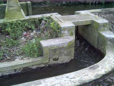 Tempel selbst ist verschlossen. Daneben ein Bach, mit Wehren zur